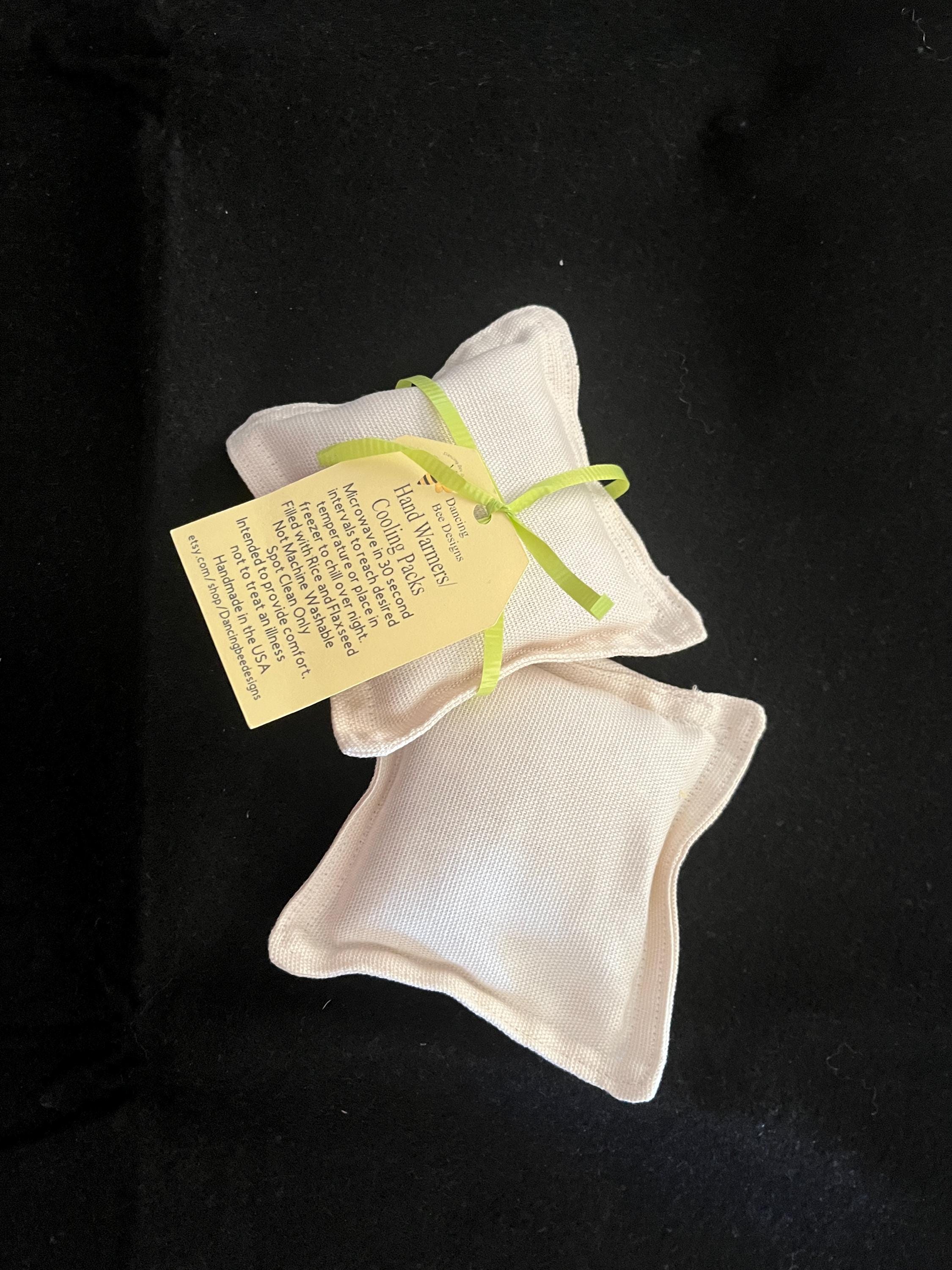 These are reusable Hot/Cold Packs that are filled with a mixture of Rice and Flaxseed. The packs can be placed in the microwave and heated in 30 second intervals until they reach your preferred temperature. Be careful when removing them from the microwave to ensure they are not too hot to touch. They can also be stored in the freezer and used as an ice pack. The variety of sizes allows you to choose when you best need them. Keep the Hand Warmers in your pockets for a chilly day or use the head or neck packs to help ease your headaches or tension.