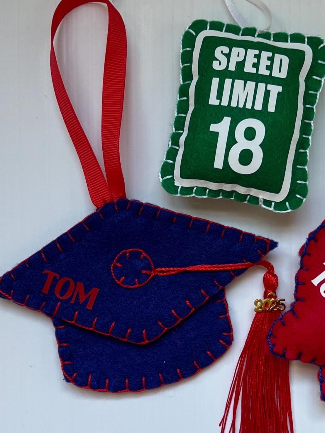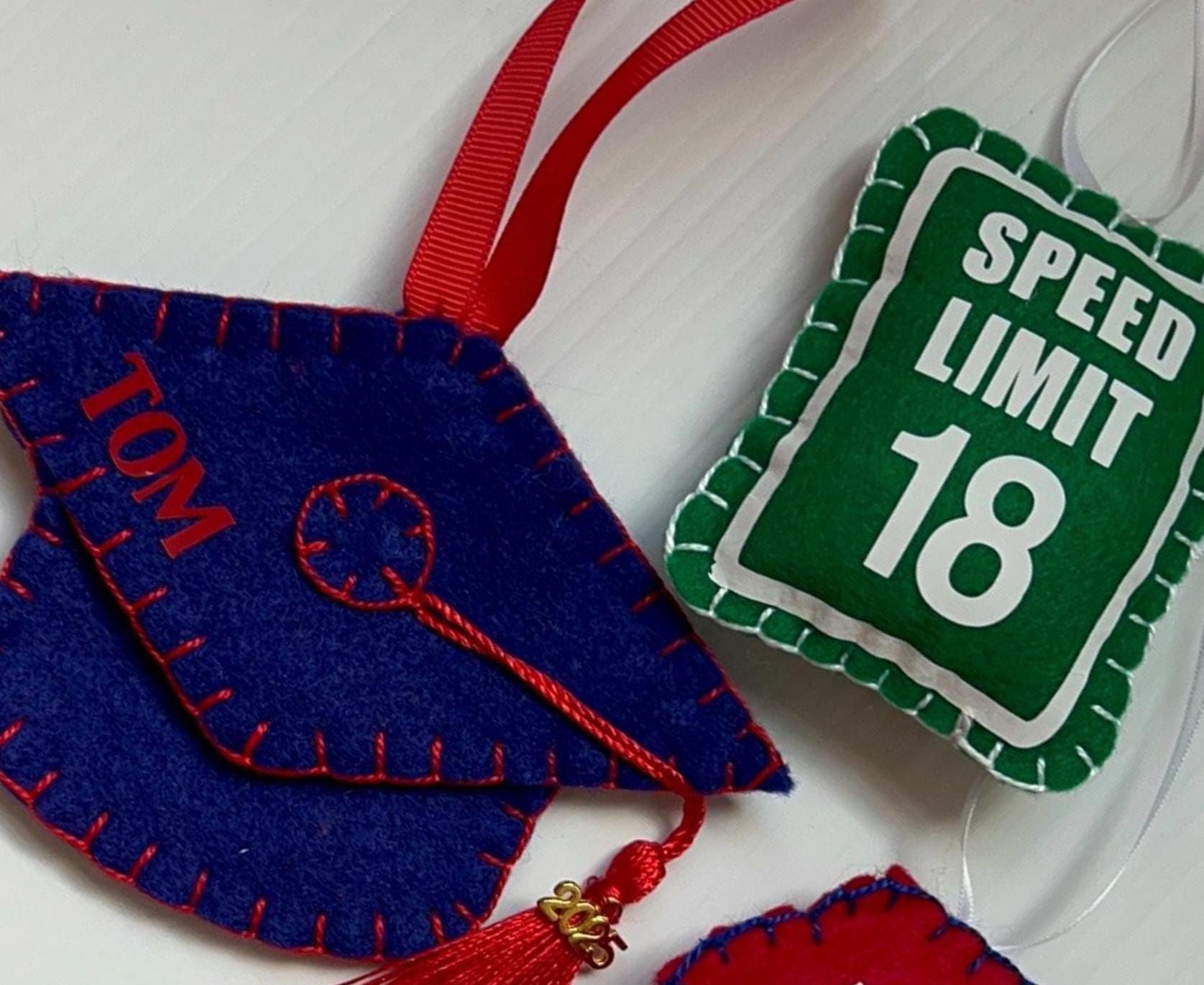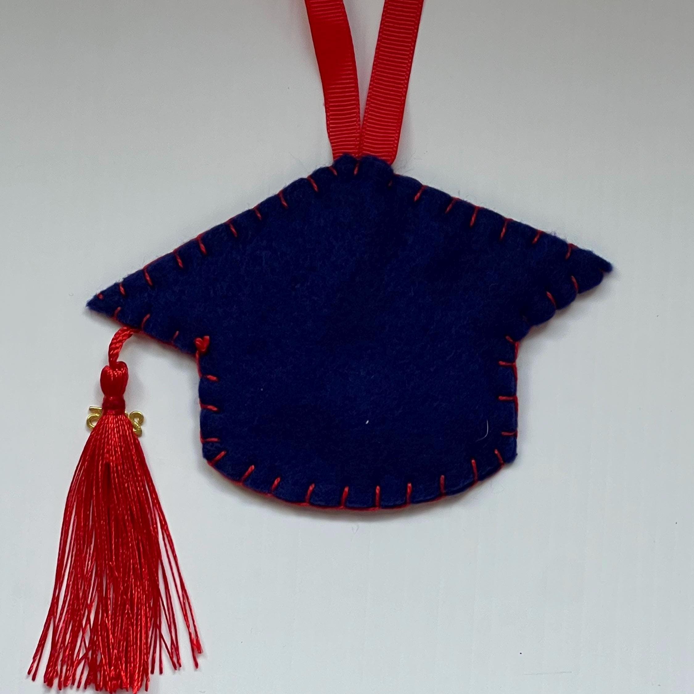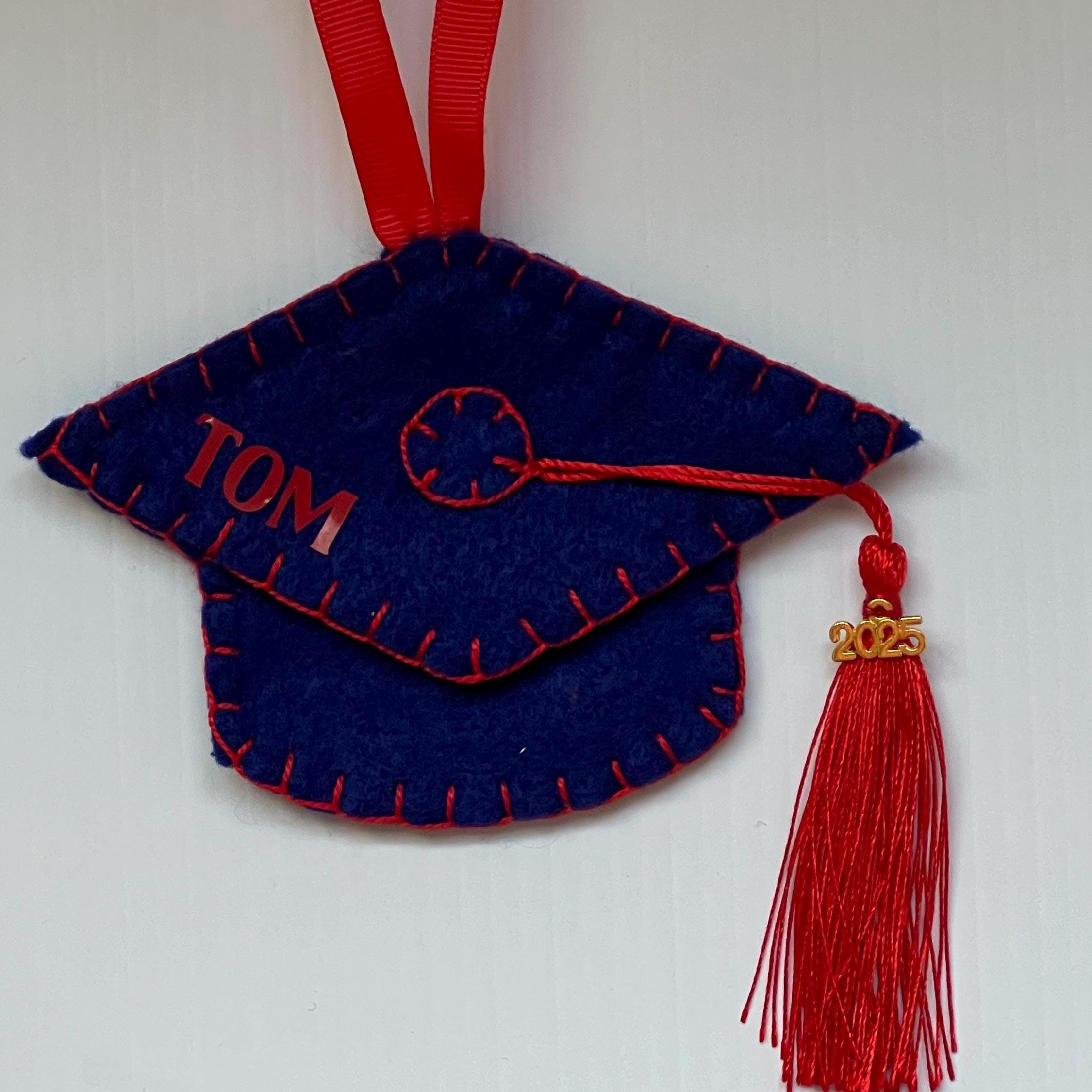 The Personalized, Graduation Ornament is handmade by me using felt, a polyester tassel and graduation year charm. The name is added using red, iron on vinyl. Please write in the notes what name you would like on the cap and the year you would like. It measures 5 1/2 inches across and 3 inches tall