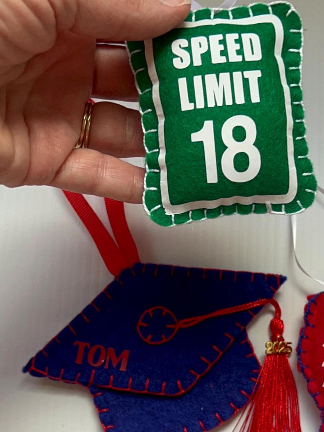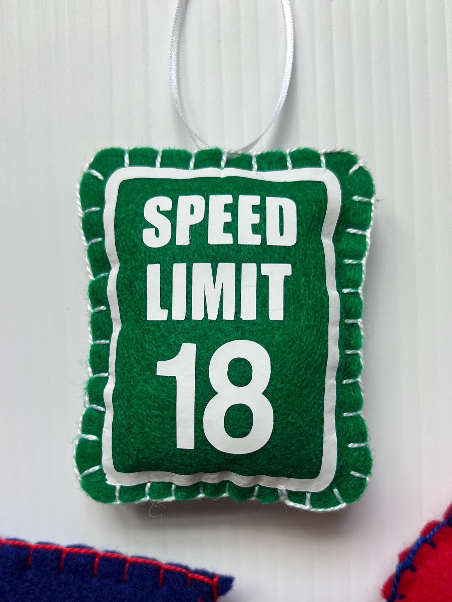 The Speed Limit 18 ornament measures 3.5” x 2.75”