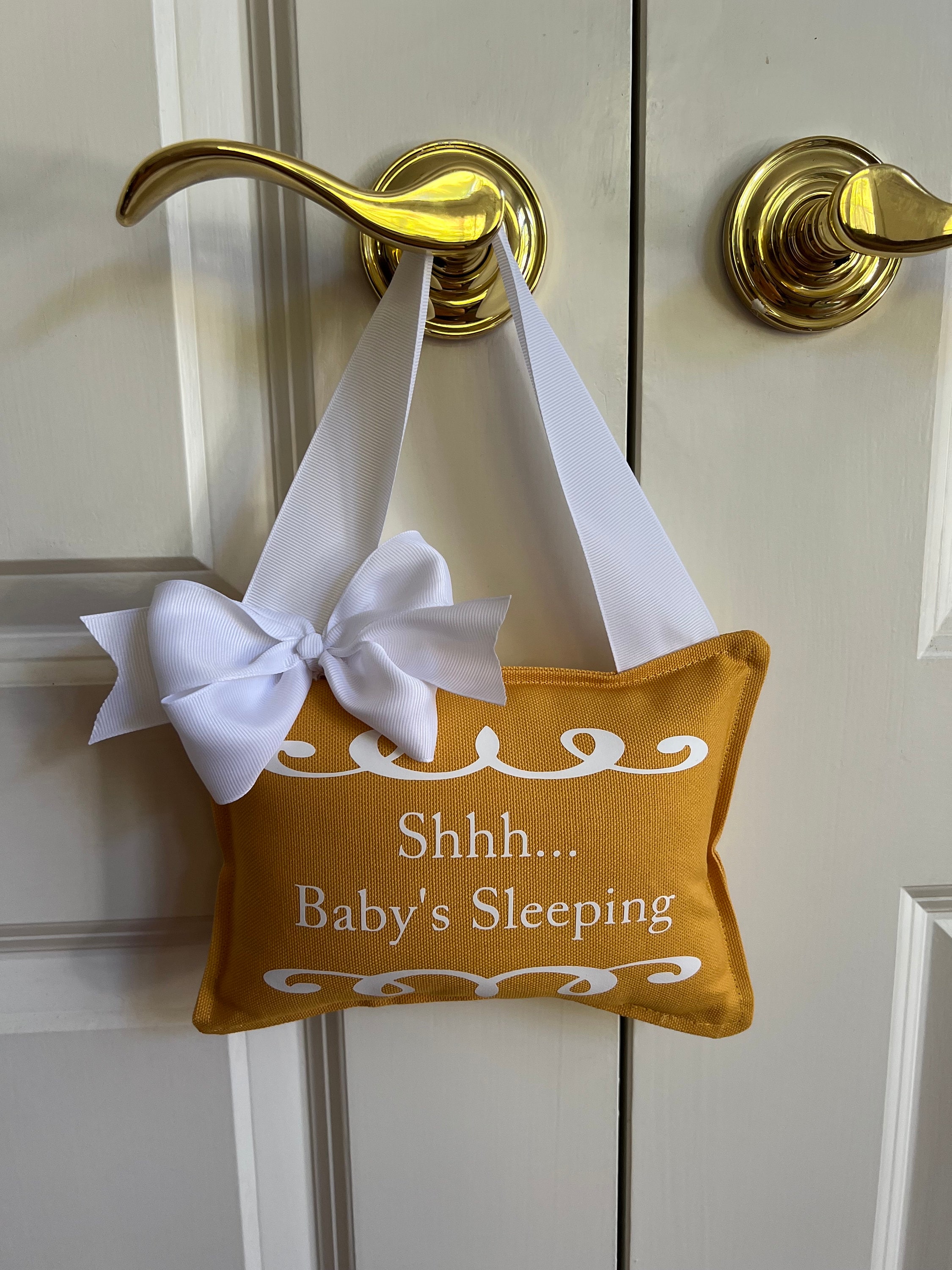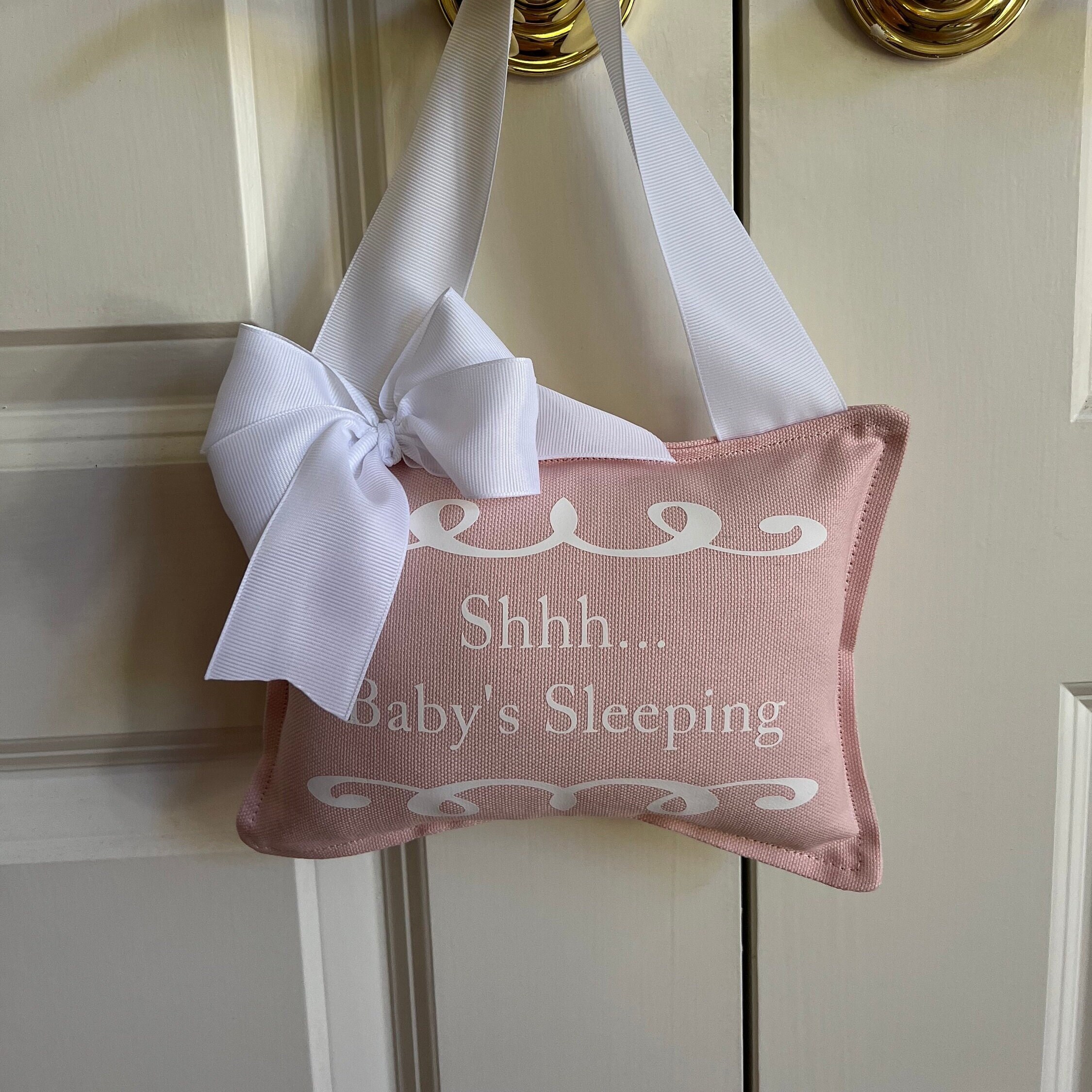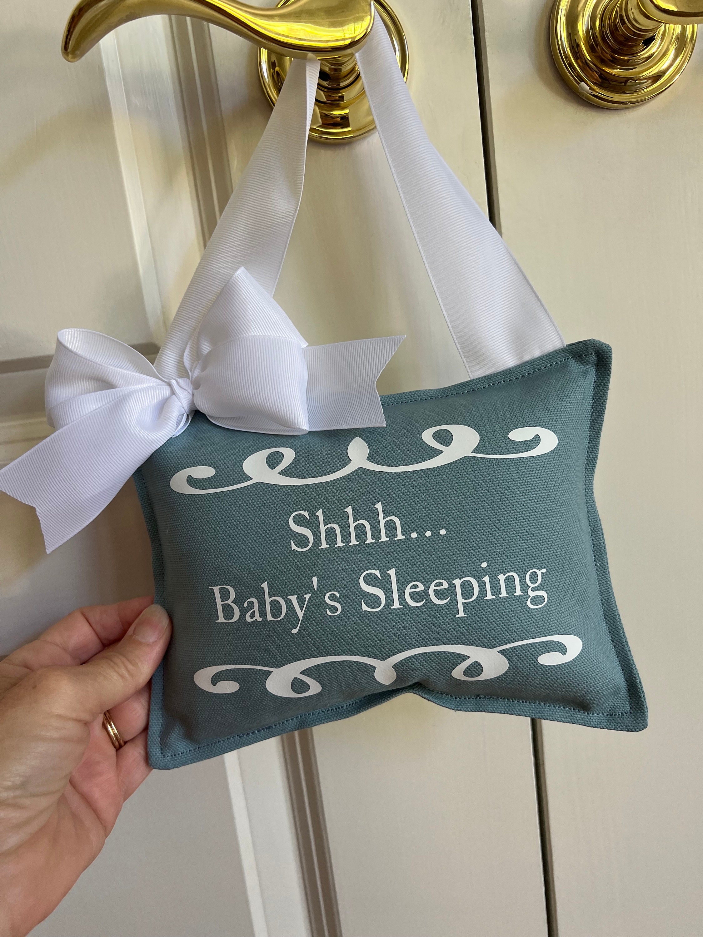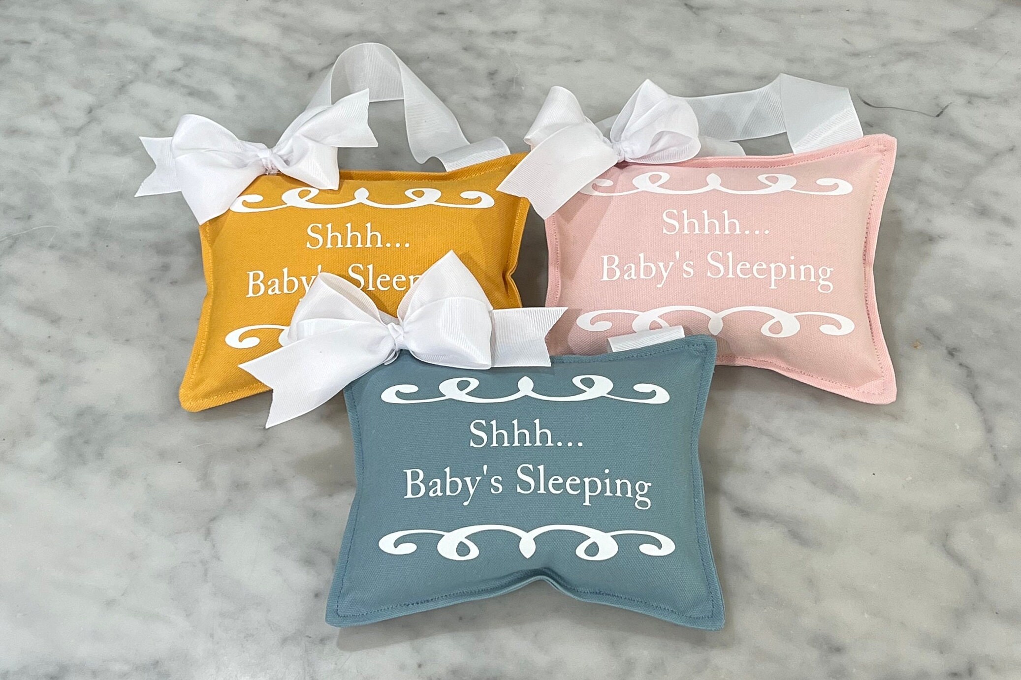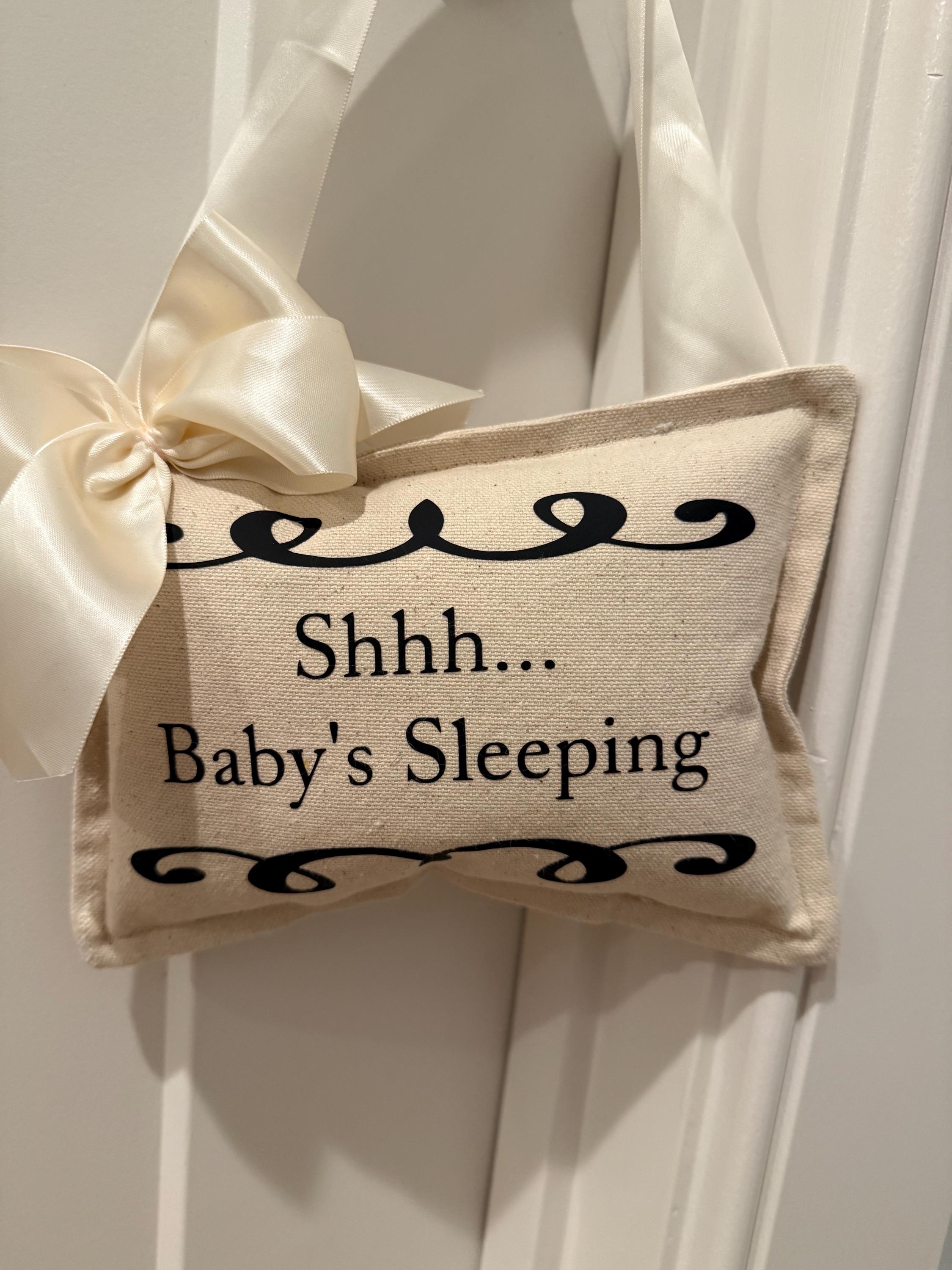 Shh...Baby's Sleeping! You never want to wake a sleeping baby!! This hanging Baby's Sleeping sign is a perfect for Baby Shower, New Parent or Baby Gift. It measures 8" x 6" x 2" and has a ribbon to hang from the door knob. The wording is added with Iron On Vinyl. It is filled with Poly-fil and made with Cotton Canvas fabric.