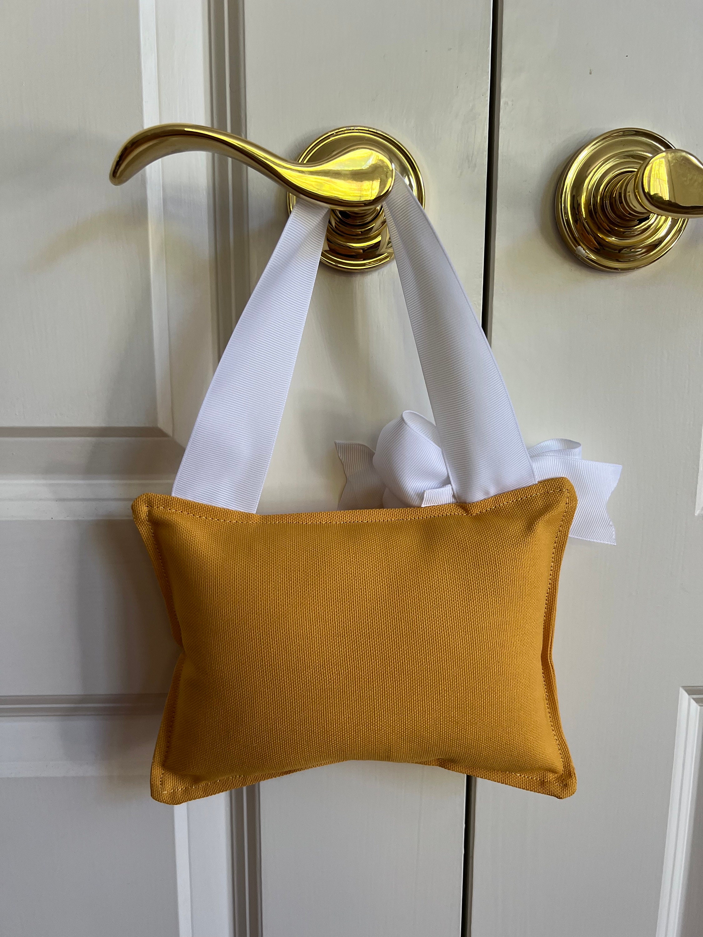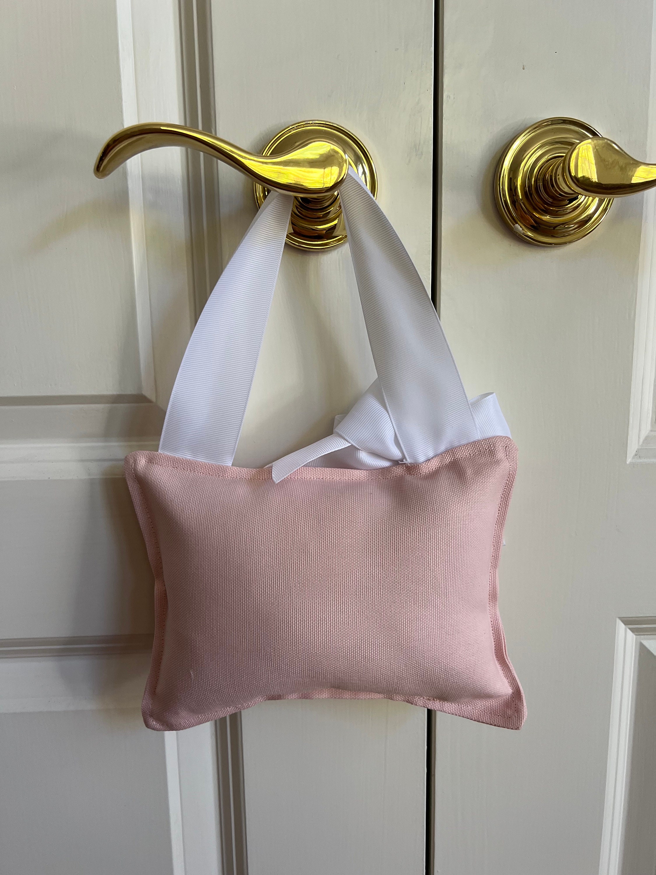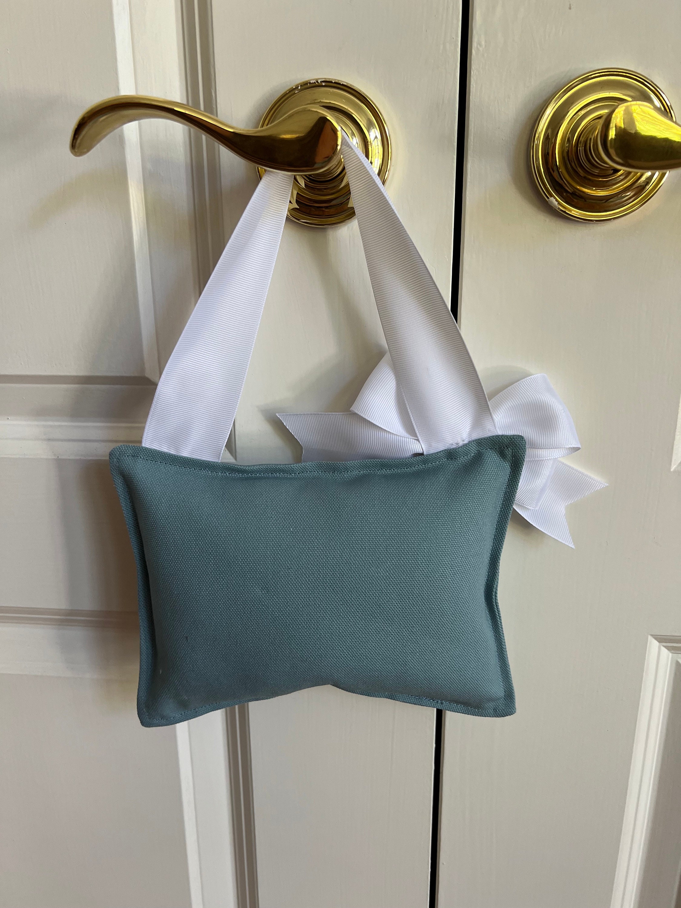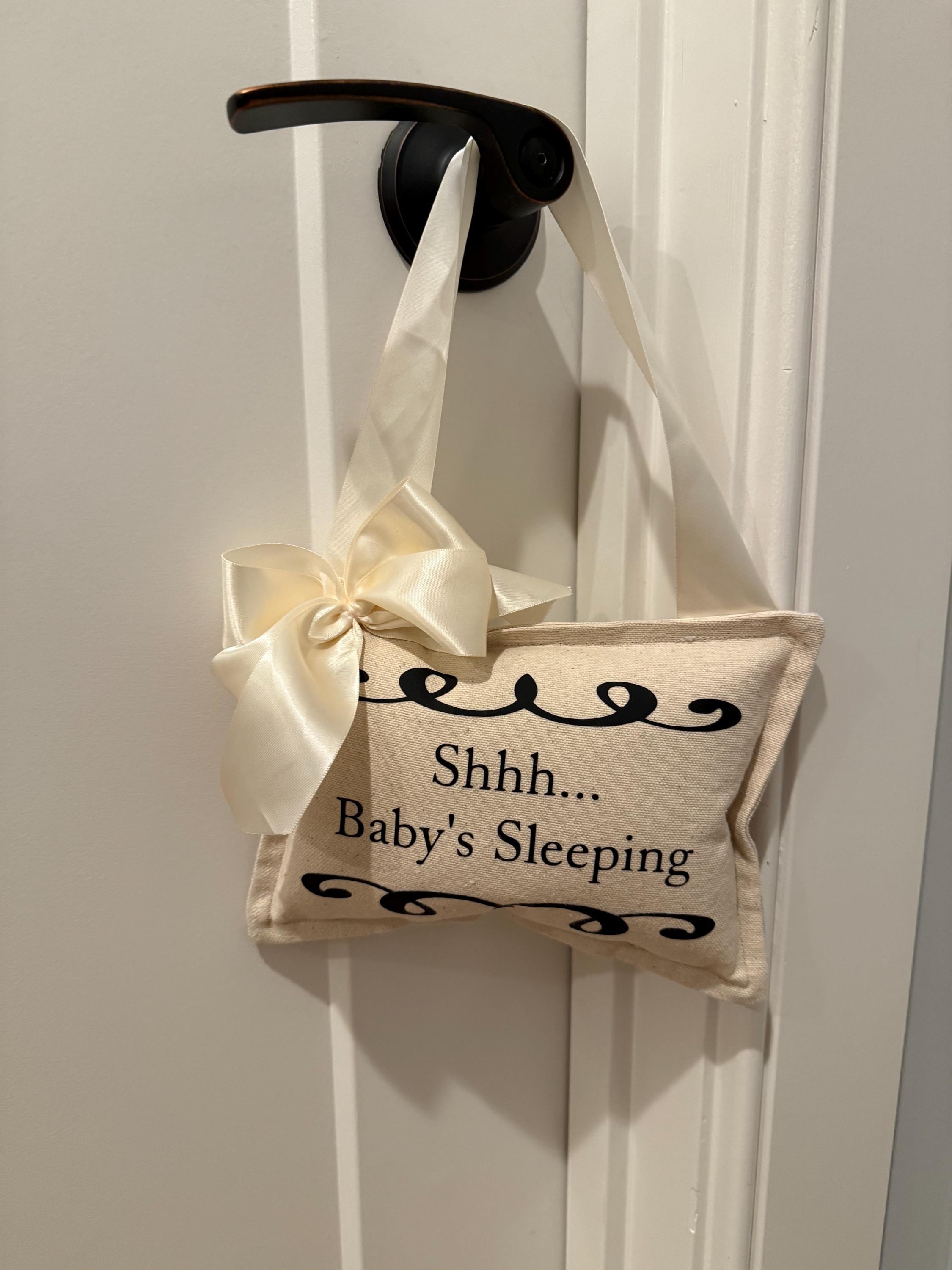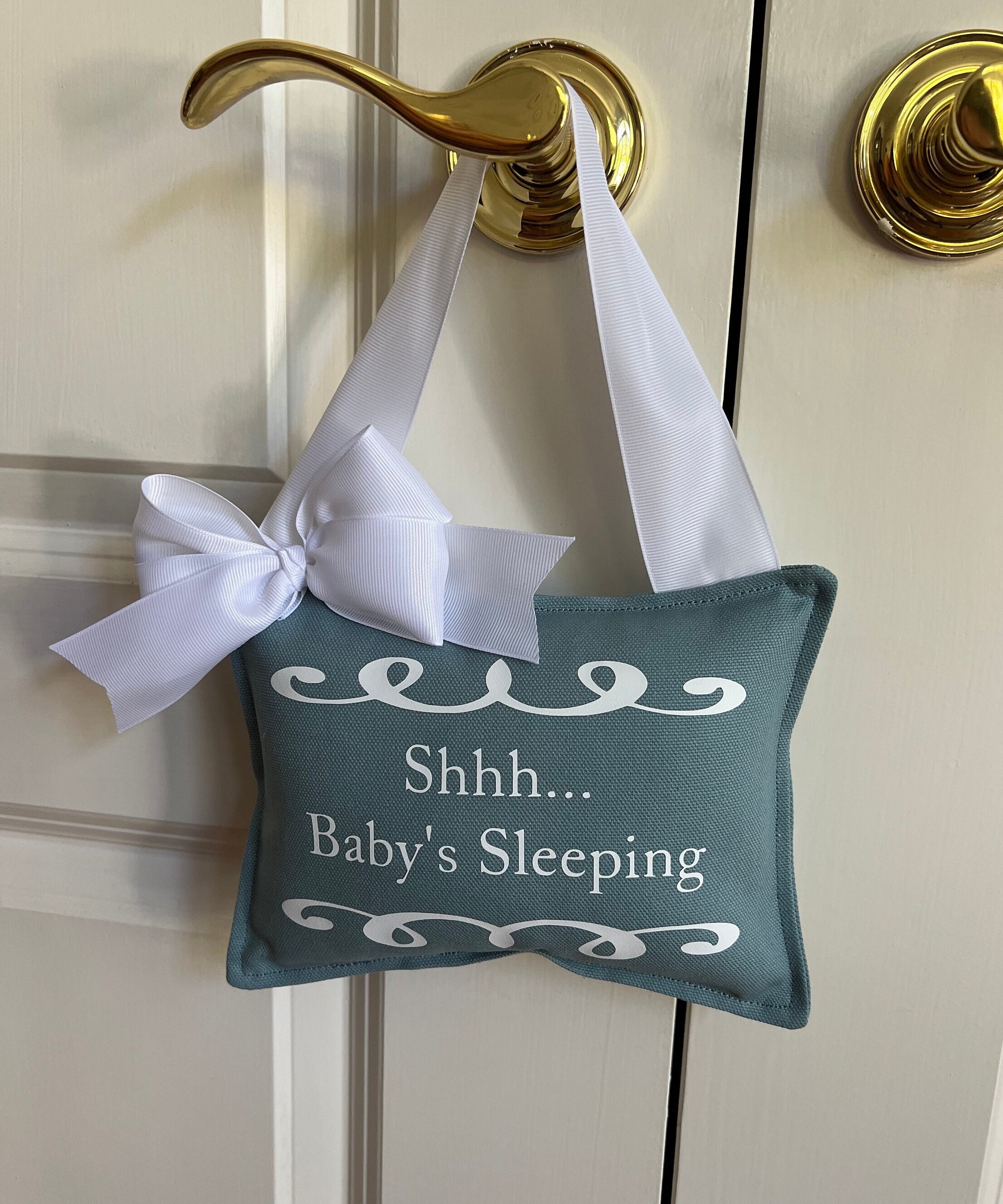 Shh...Baby's Sleeping! You never want to wake a sleeping baby!! This hanging Baby's Sleeping sign is a perfect for Baby Shower, New Parent or Baby Gift. It measures 8" x 6" x 2" and has a ribbon to hang from the door knob. The wording is added with Iron On Vinyl. It is filled with Poly-fil and made with Cotton Canvas fabric.