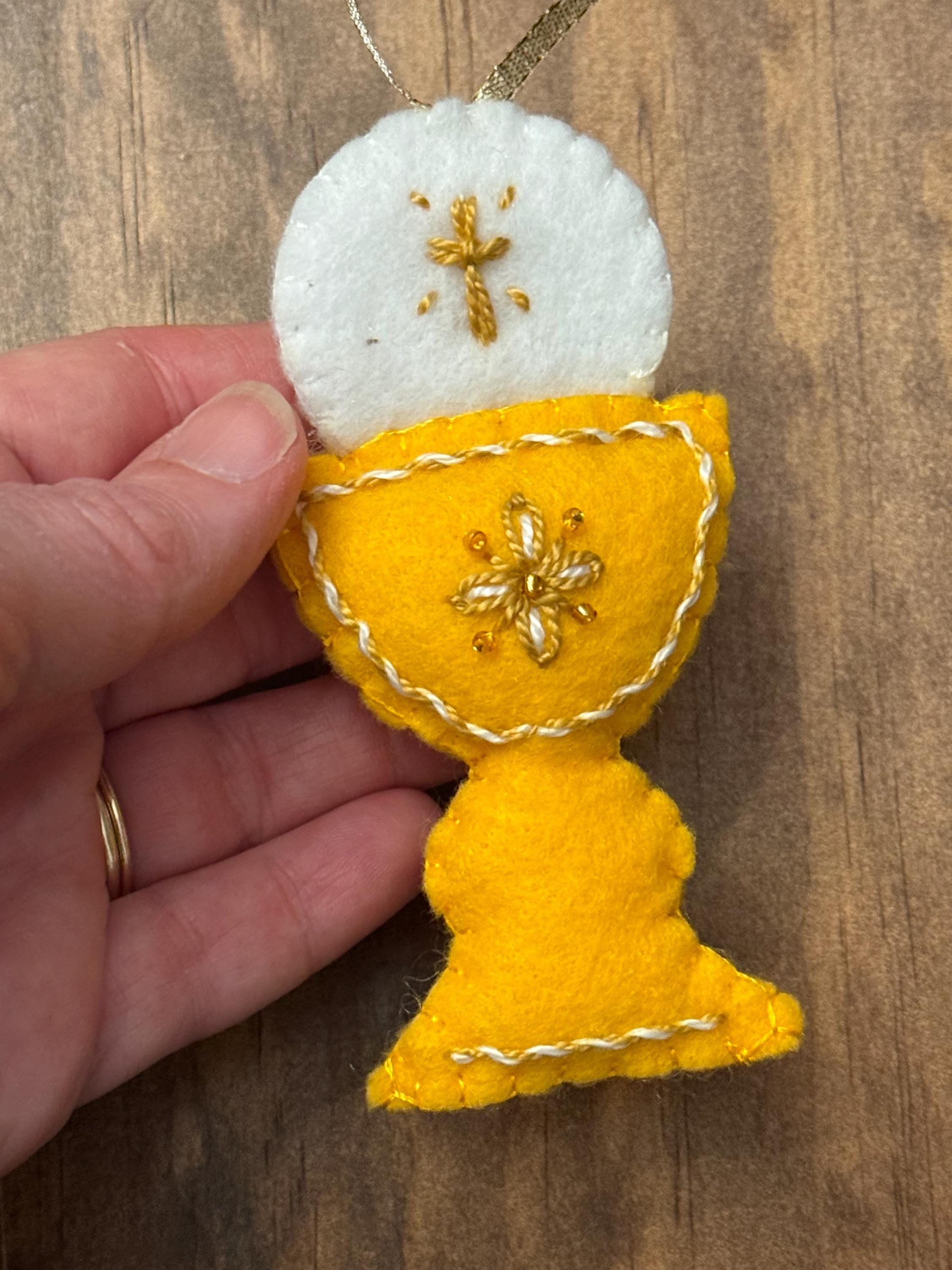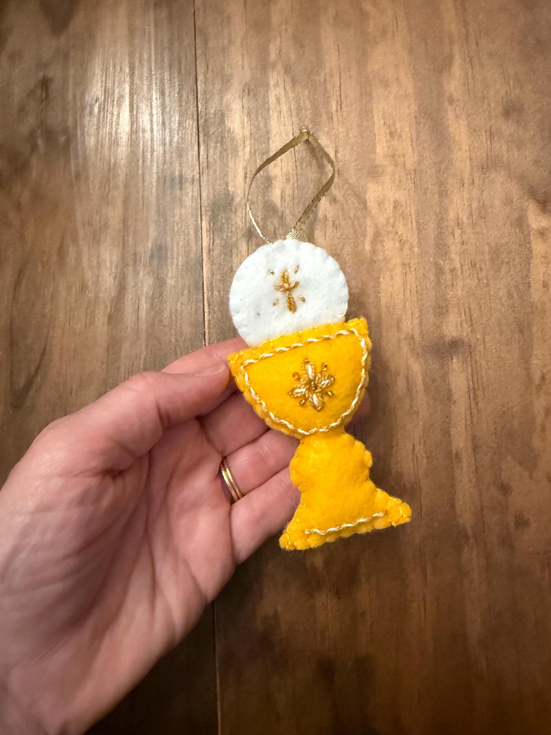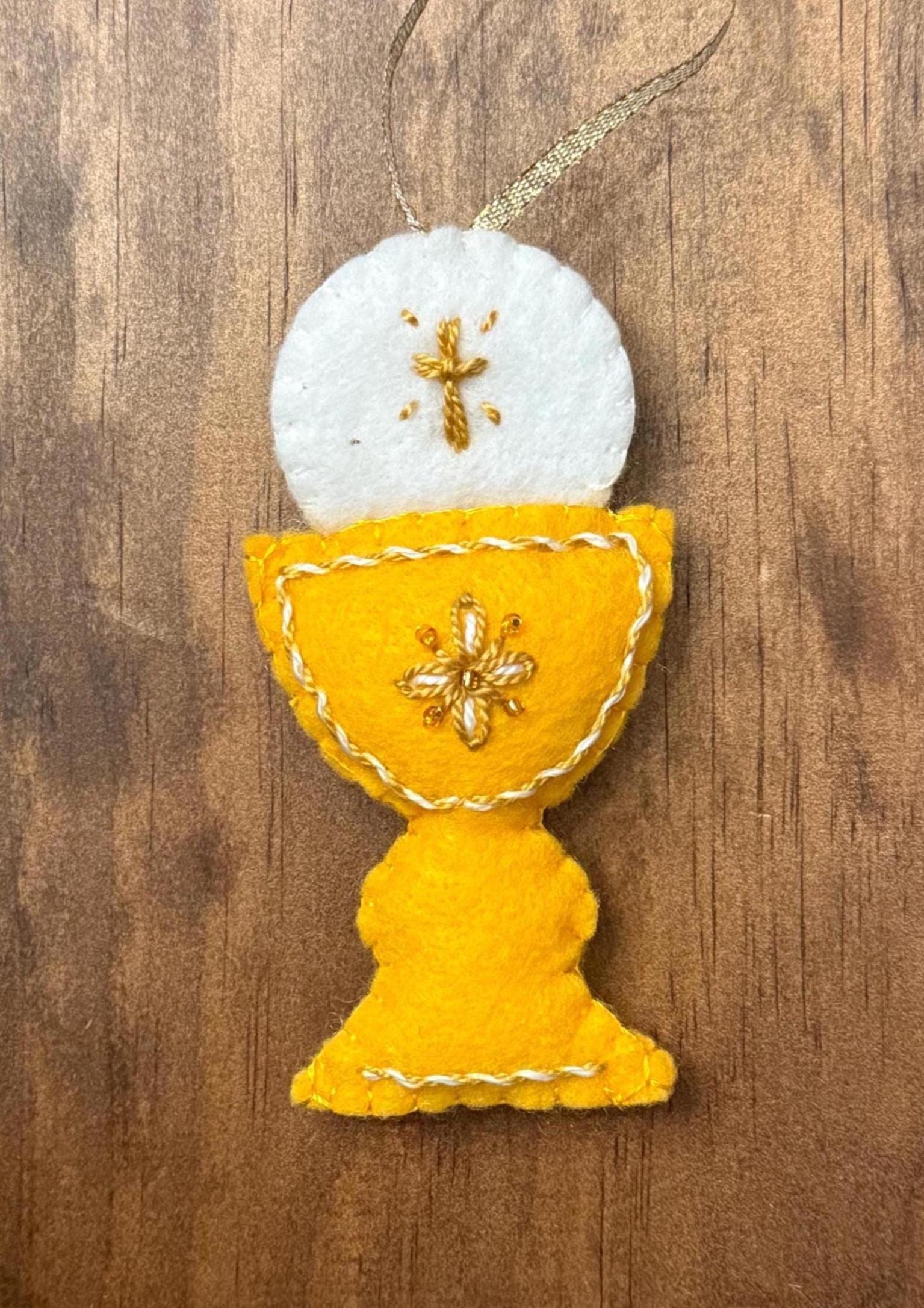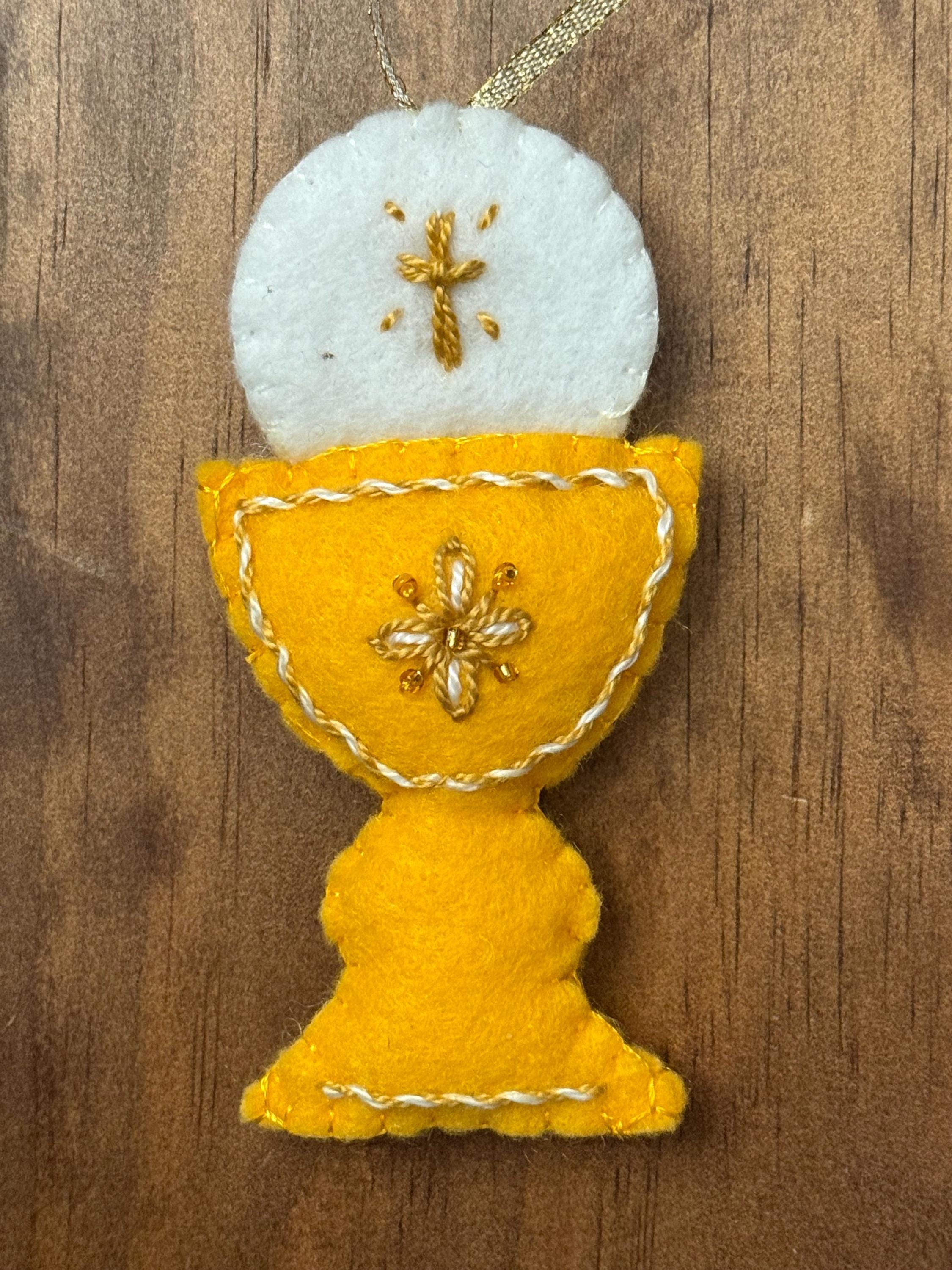 Commemorate a sacred milestone with this beautiful, handcrafted felt ornament. Designed to represent the Chalice and Sacred Host, this piece is the perfect keepsake for a First Holy Communion, Confirmation, Baptism, Easter or as a meaningful addition to your family’s Christmas tree.