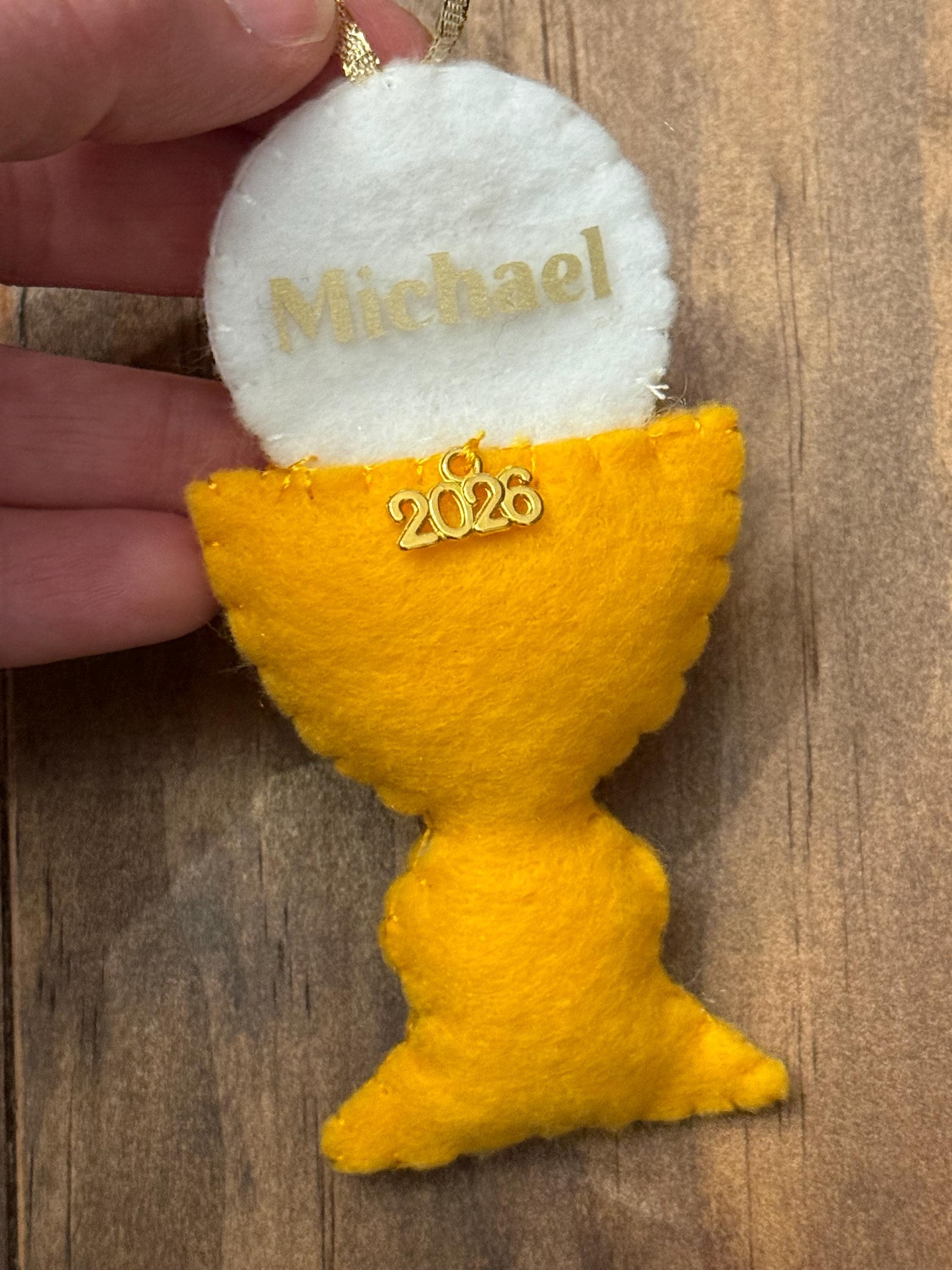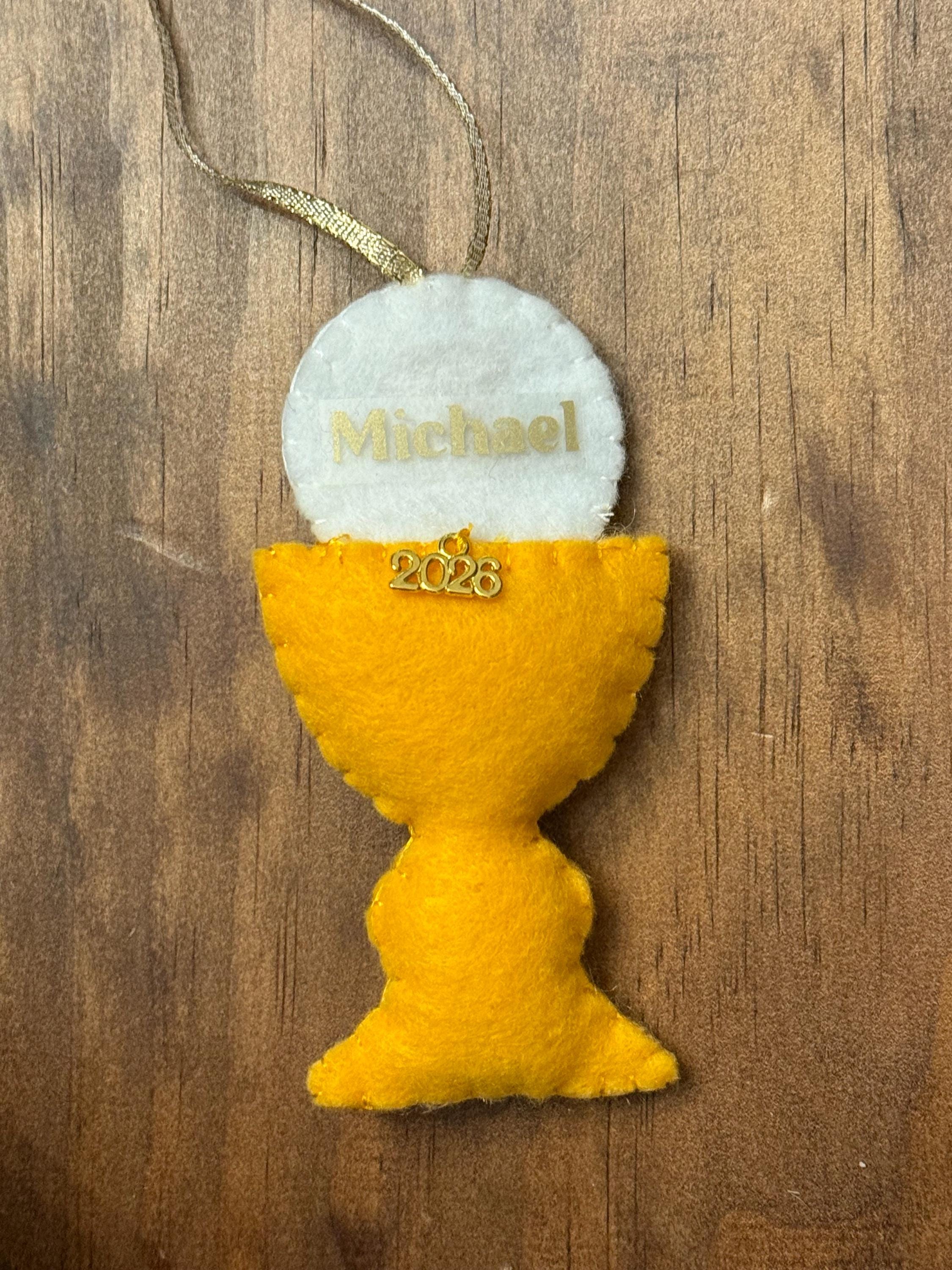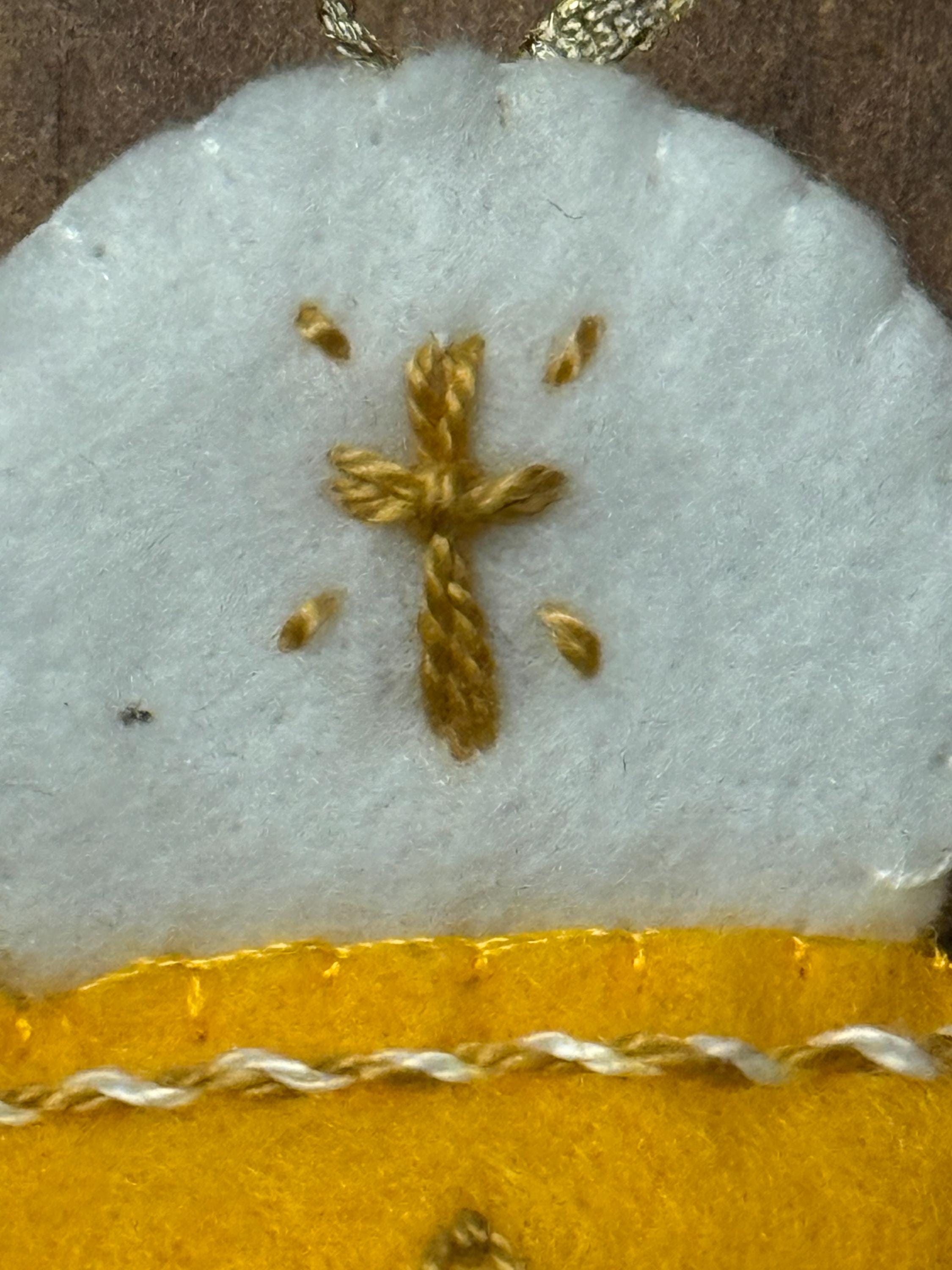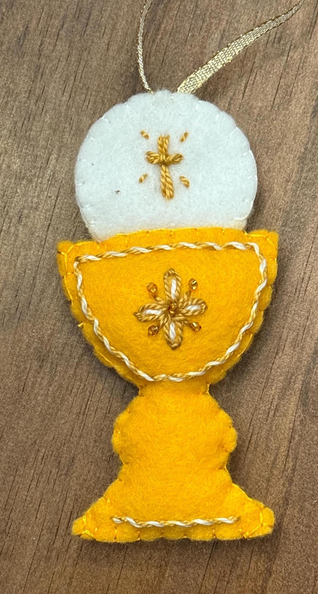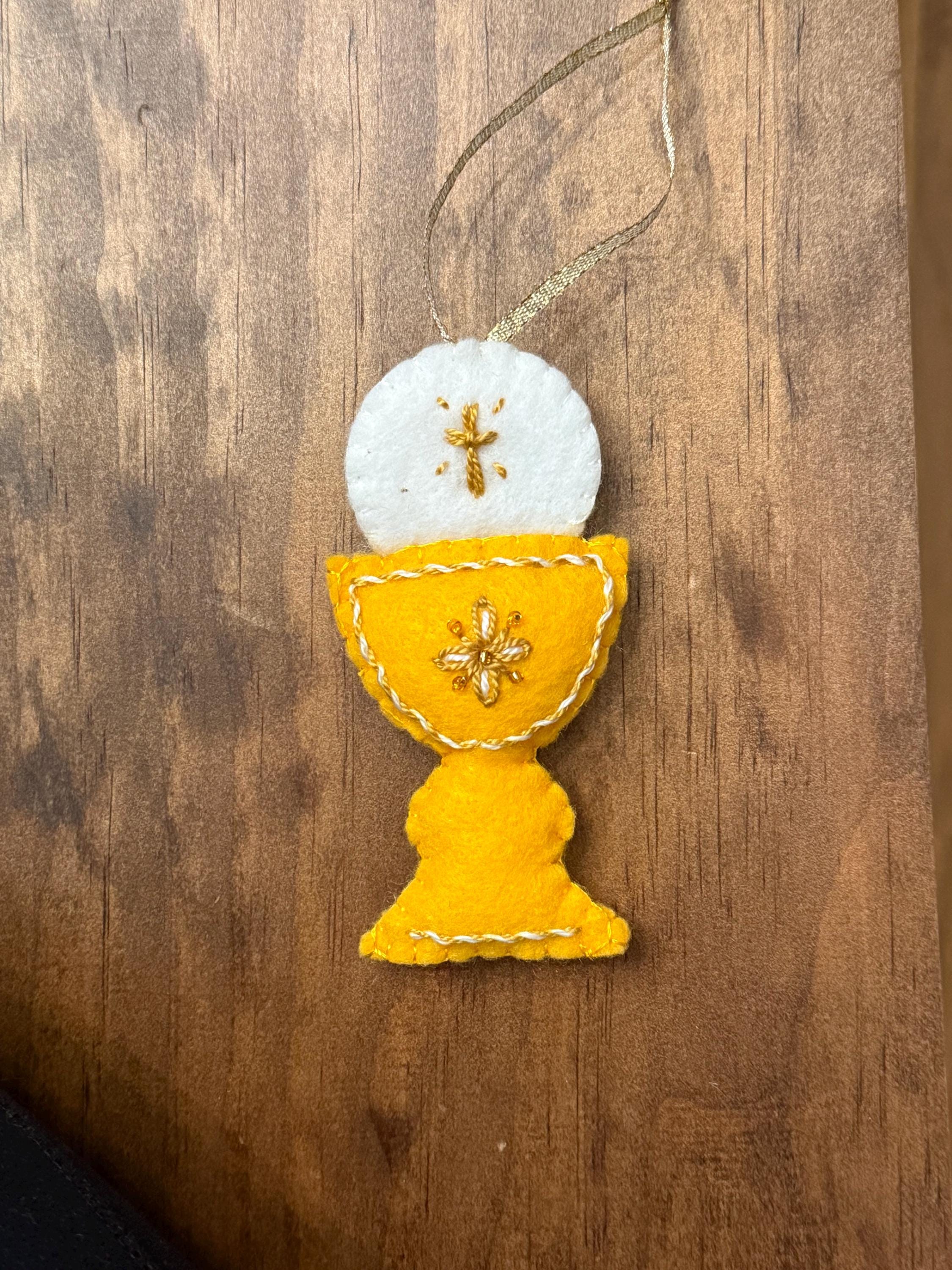 Commemorate a sacred milestone with this beautiful, handcrafted felt ornament. Designed to represent the Chalice and Sacred Host, this piece is the perfect keepsake for a First Holy Communion, Confirmation, Baptism, Easter or as a meaningful addition to your family’s Christmas tree.