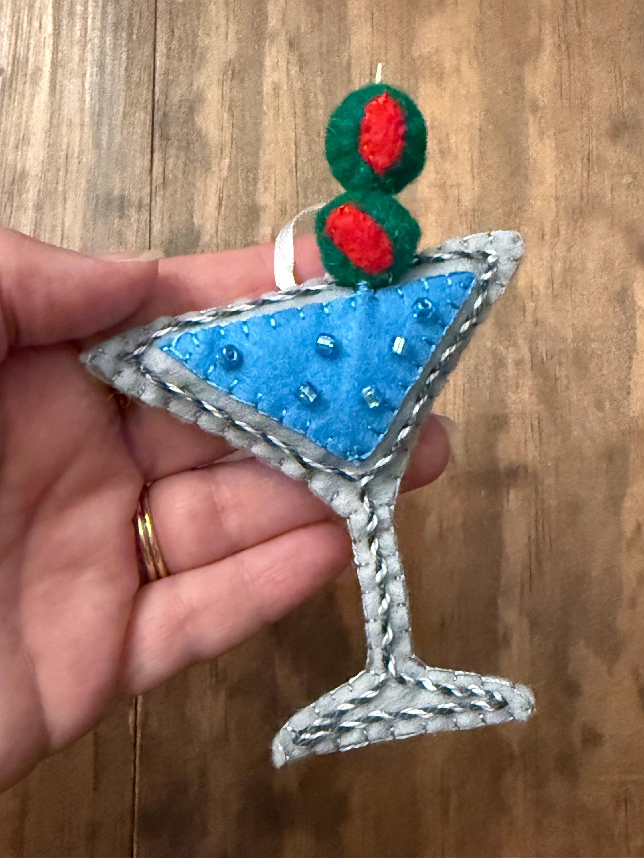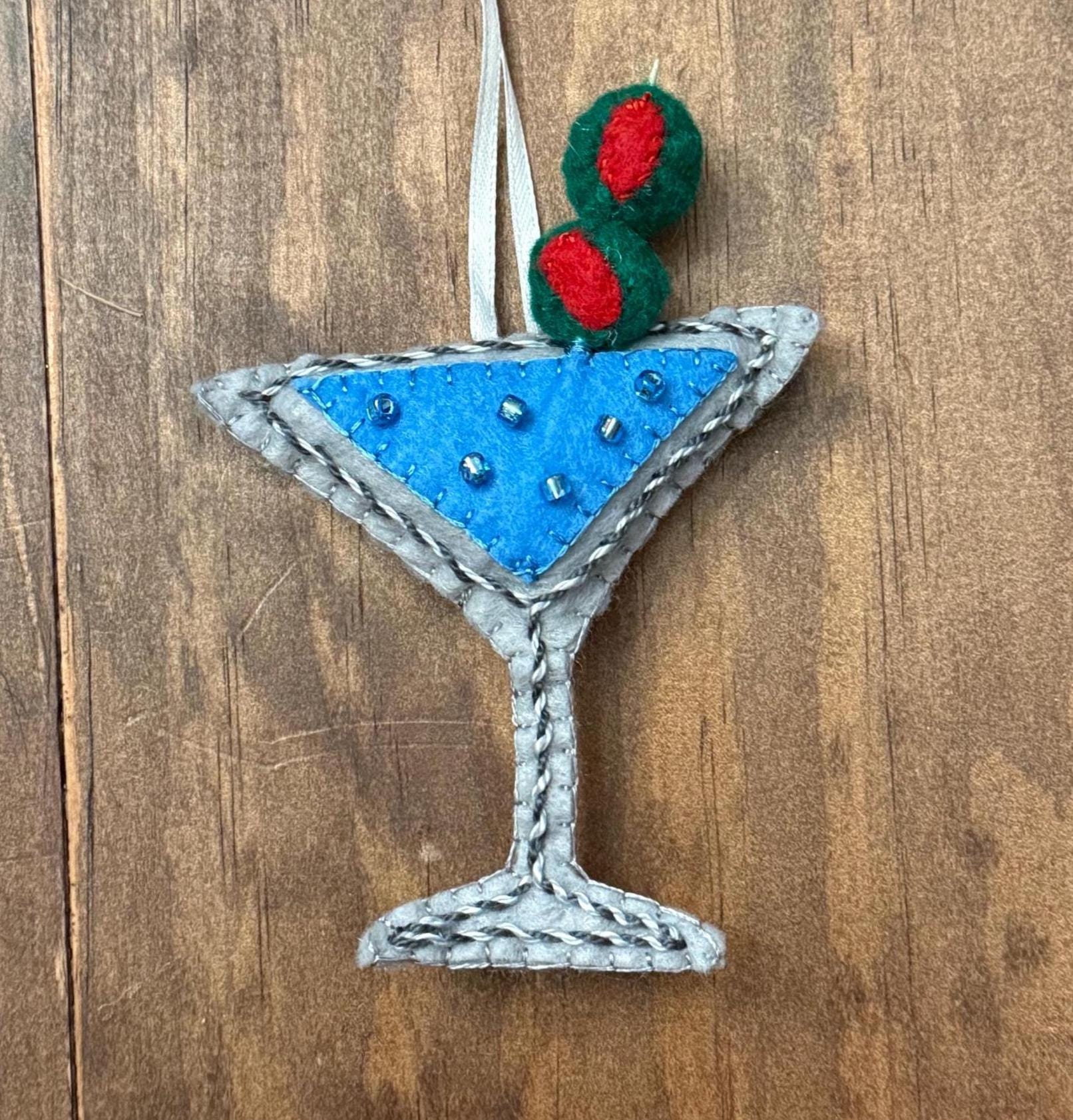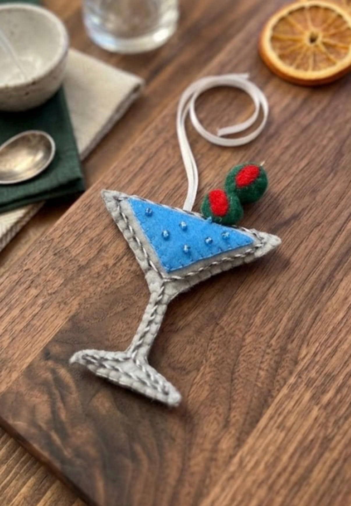 Cheers to the holiday season! This handmade felt martini ornament is the perfect blend of cute and craft for your Christmas tree or bar cart decor. Whether you’re a fan of a classic gin martini or just love a good "Blue Bayou" cocktail, this little guy adds a splash of personality to any celebration.