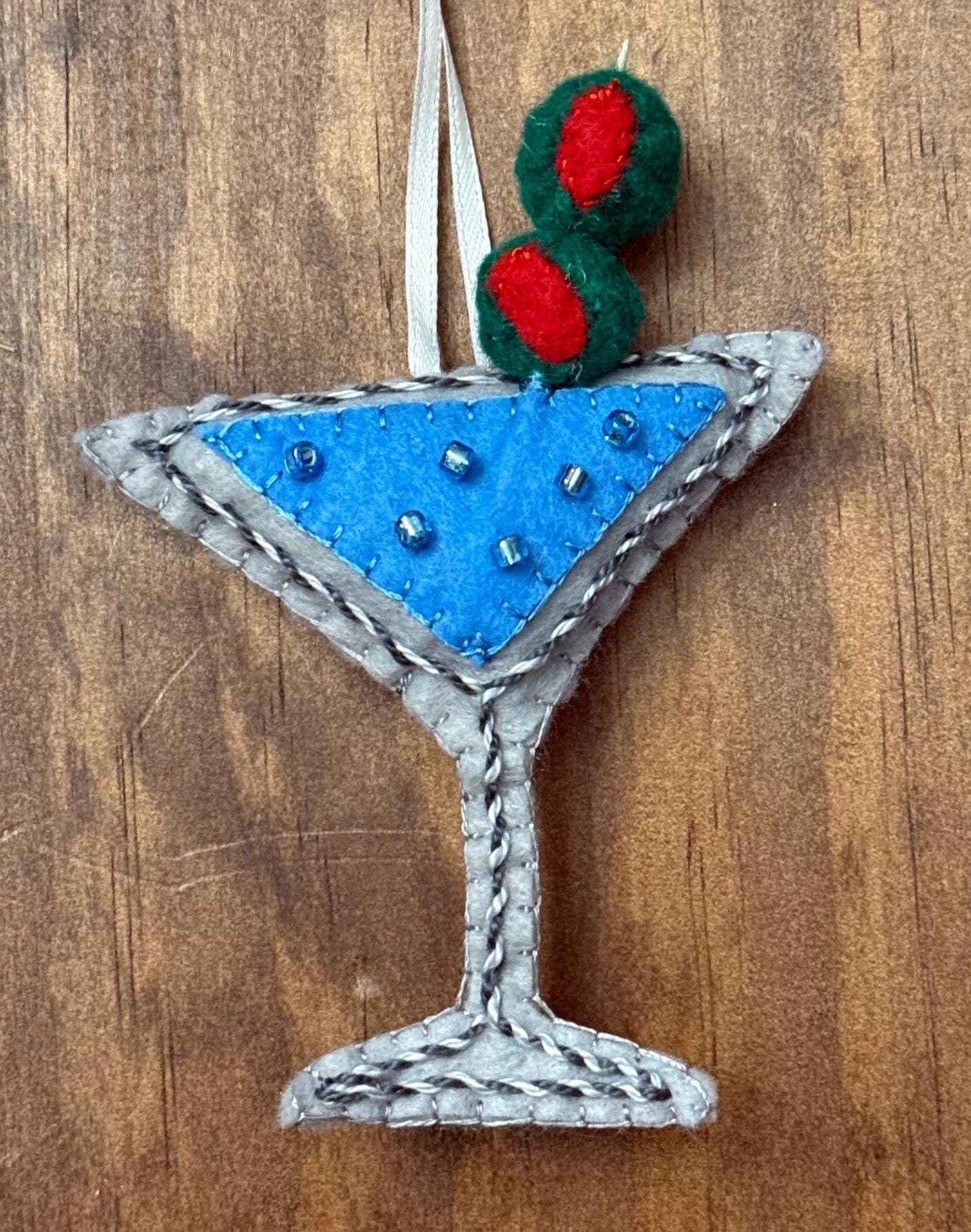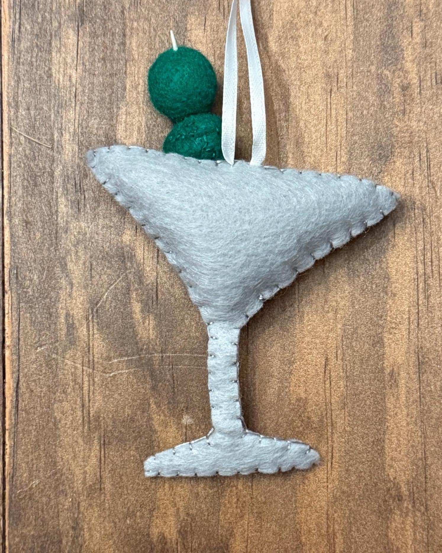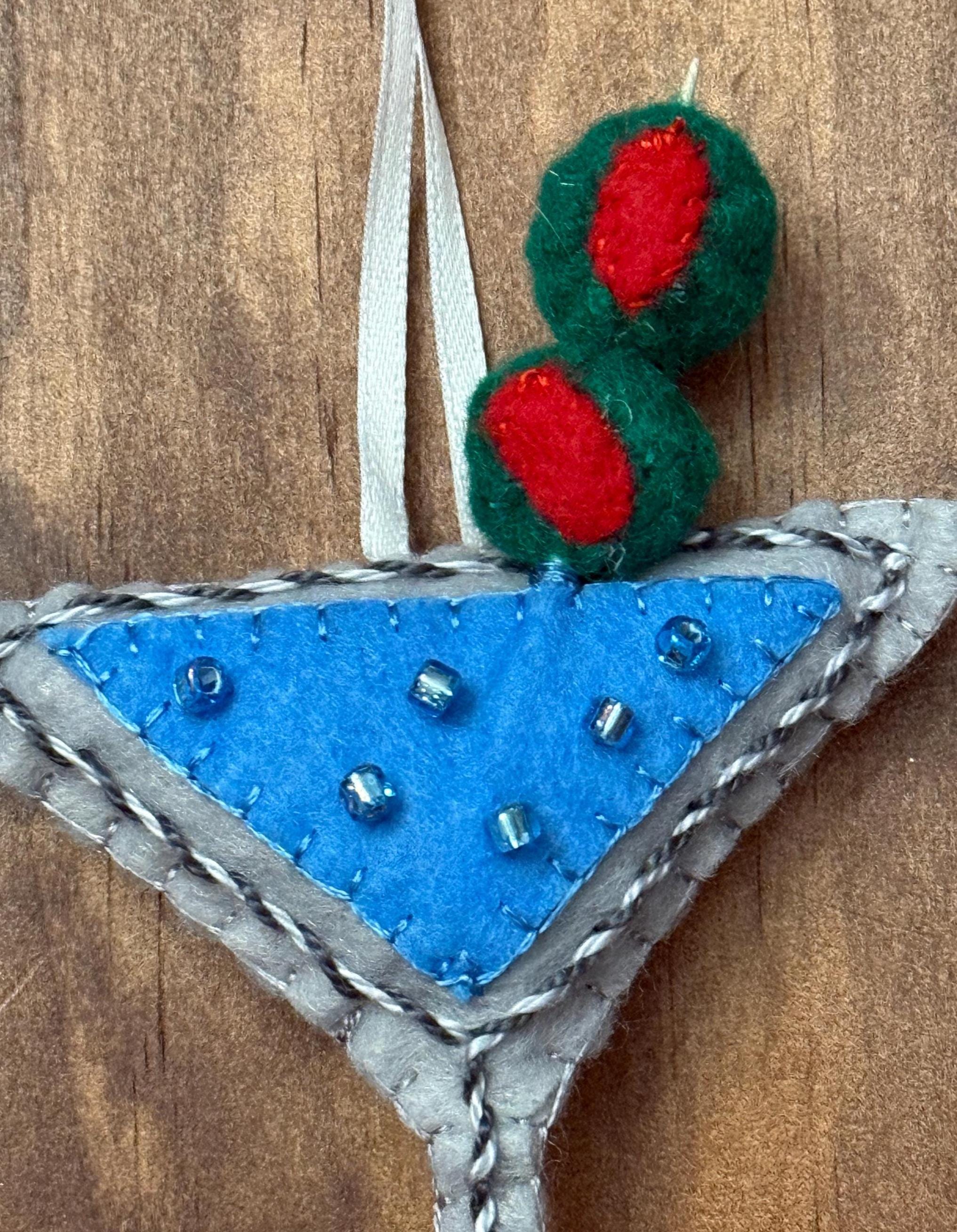 Cheers to the holiday season! This handmade felt martini ornament is the perfect blend of cute and craft for your Christmas tree or bar cart decor. Whether you’re a fan of a classic gin martini or just love a good "Blue Bayou" cocktail, this little guy adds a splash of personality to any celebration.